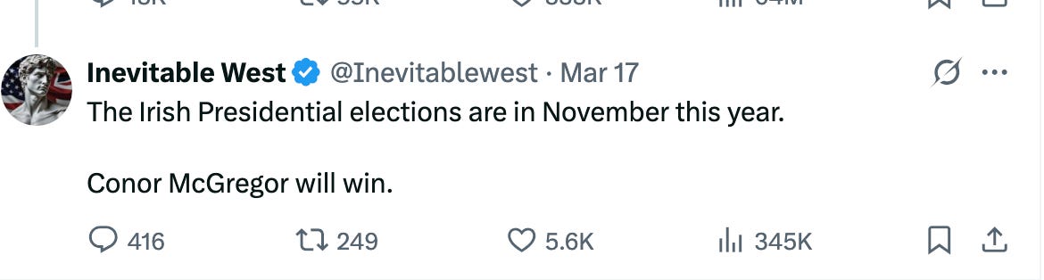 Why am I talking about Conor McGregor as a potential candidate in an Irish Presidential election? McGregor was a guest of Trump in the Oval Office on St Patricks Day. As soon as McGregor left the Oval the internet’s darkest corners—MAGA diehards, far-right keyboard warriors, and pro-Russian trolls began peddling the idea of McGregor as a potential candidate for the Irish presidency.