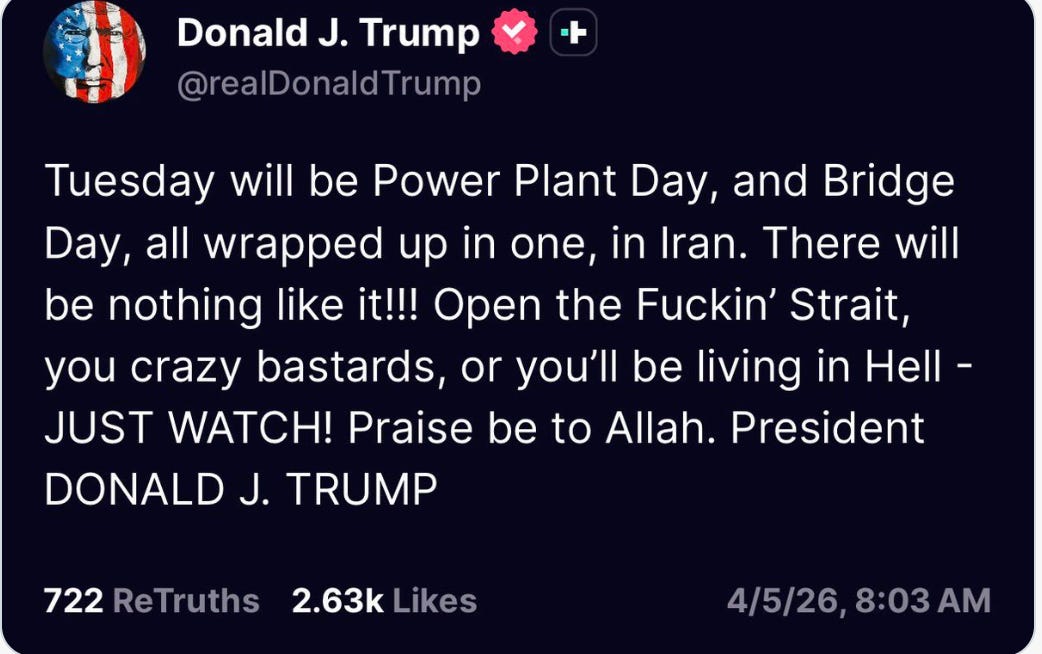 Apr 5: “Open the fuckin’ Strait, you crazy bastards, or you’ll be living in Hell - JUST WATCH! Praise be to Allah.”